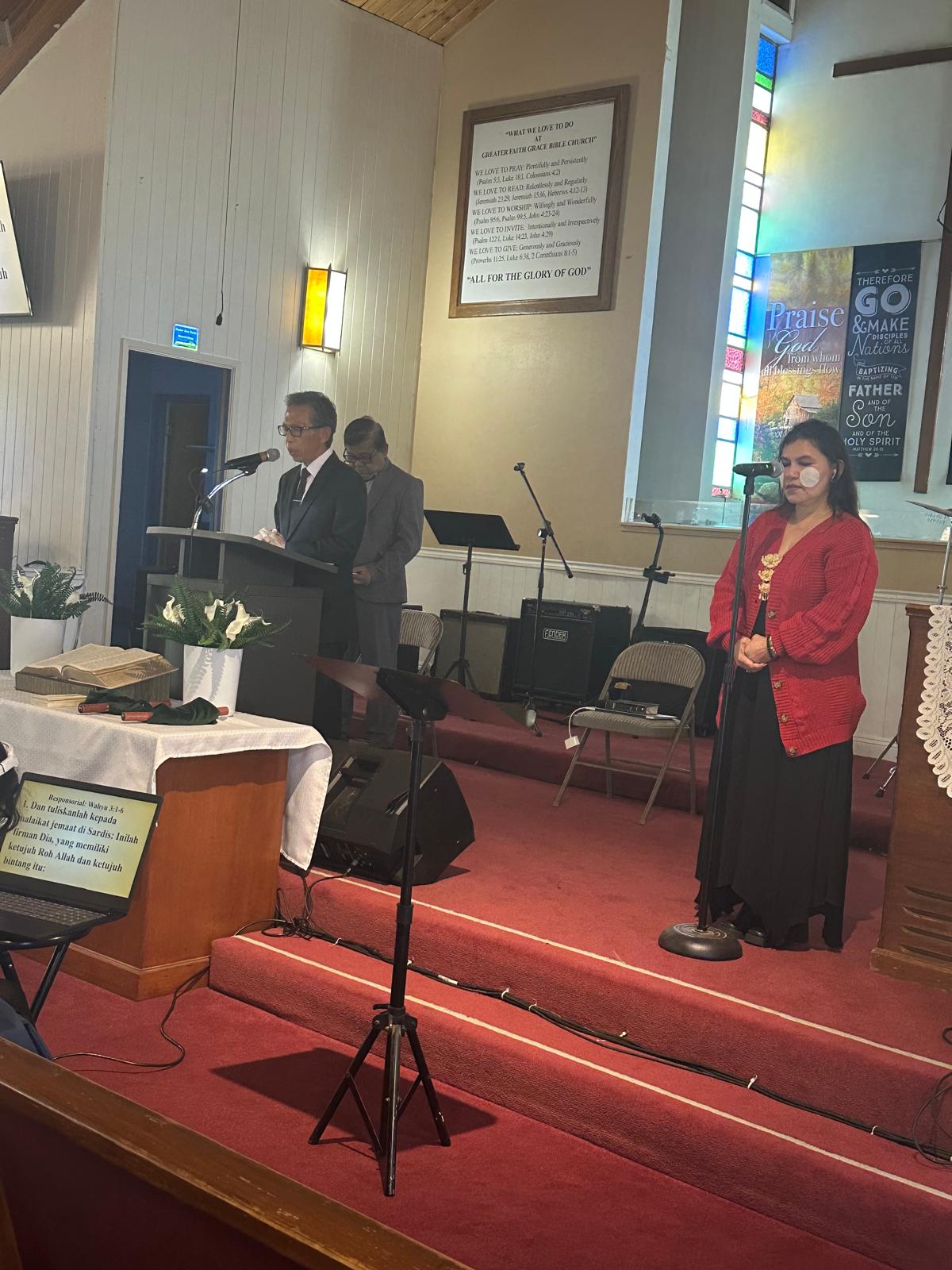 The sanctuary, modest but warmly lit, speaks volumes of the church’s commitment to simplicity and sincerity in worship. The red carpeted floor, wooden pews, and musical instruments waiting quietly in the background all contribute to the sacredness of the moment. The presence of a MacBook on the pulpit suggests that even in this humble setting, technology is being embraced for ministry — possibly to share the Word beyond the walls of the church.